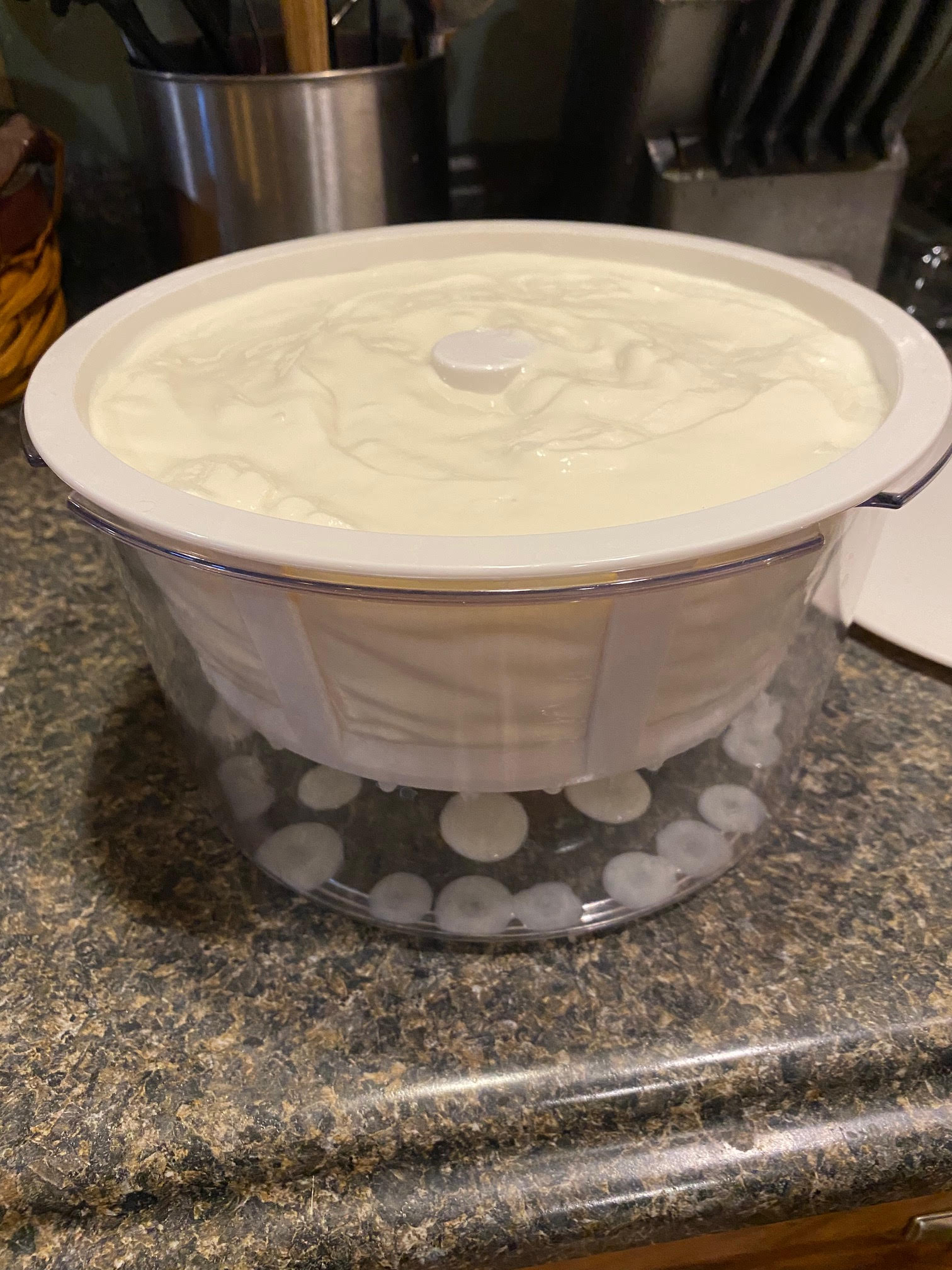 Once it is thoroughly cooled (typically I keep it in the fridge overnight), it’s time to strain it (if you want Greek yogurt).