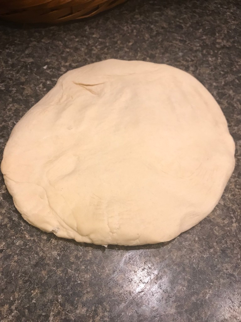 After it is finished in the bread machine, I turn it out onto my counter (I usually use a little flour and I didn’t this time so it was sticking a bit).
