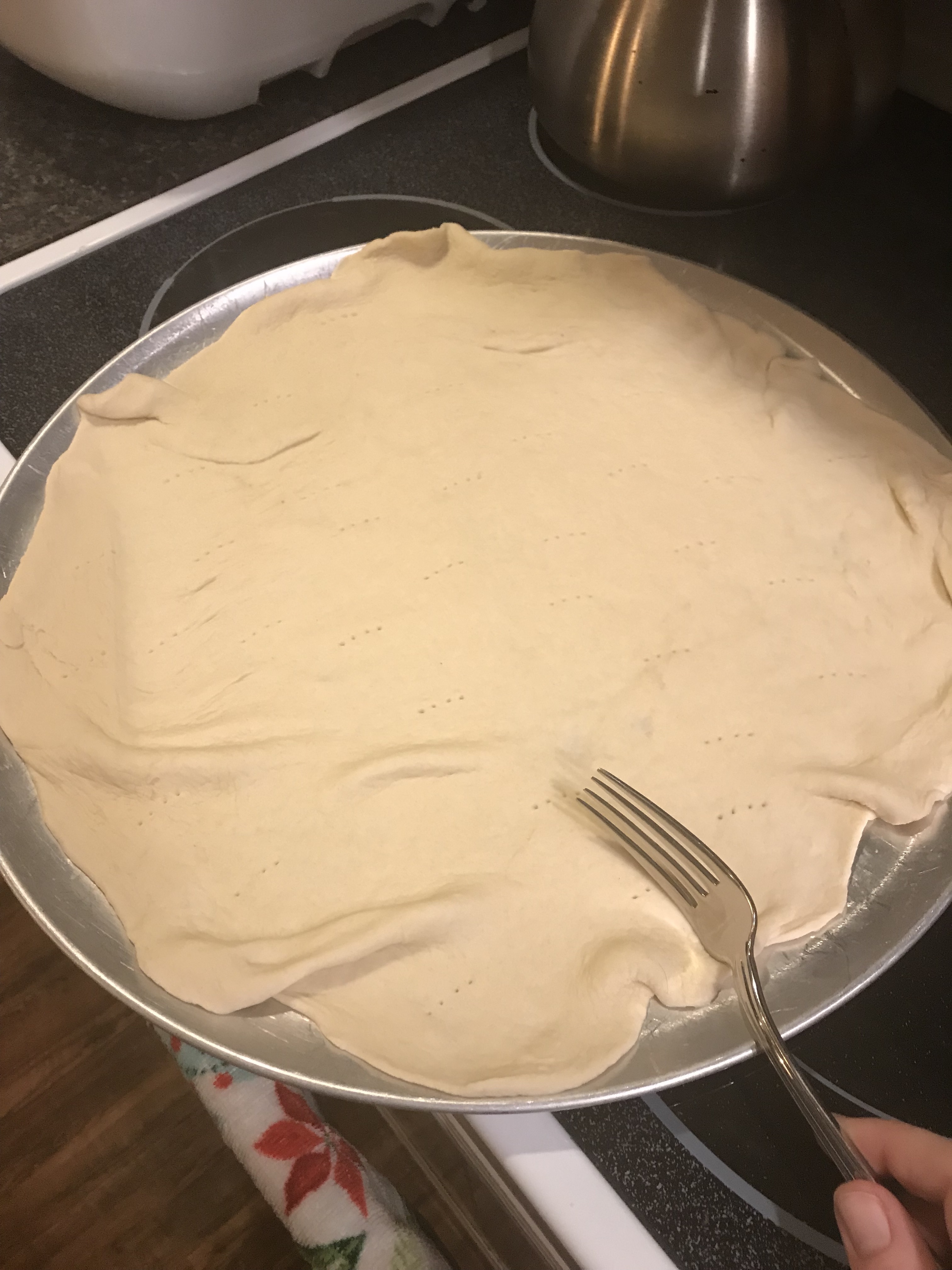 I use my amazing silicone rolling pin and roll it out into a circular shape (as best I can). I use a brush a brush a little bit of olive oil onto the pan, place the rolled dough onto the pan, and poke holes with a fork.
