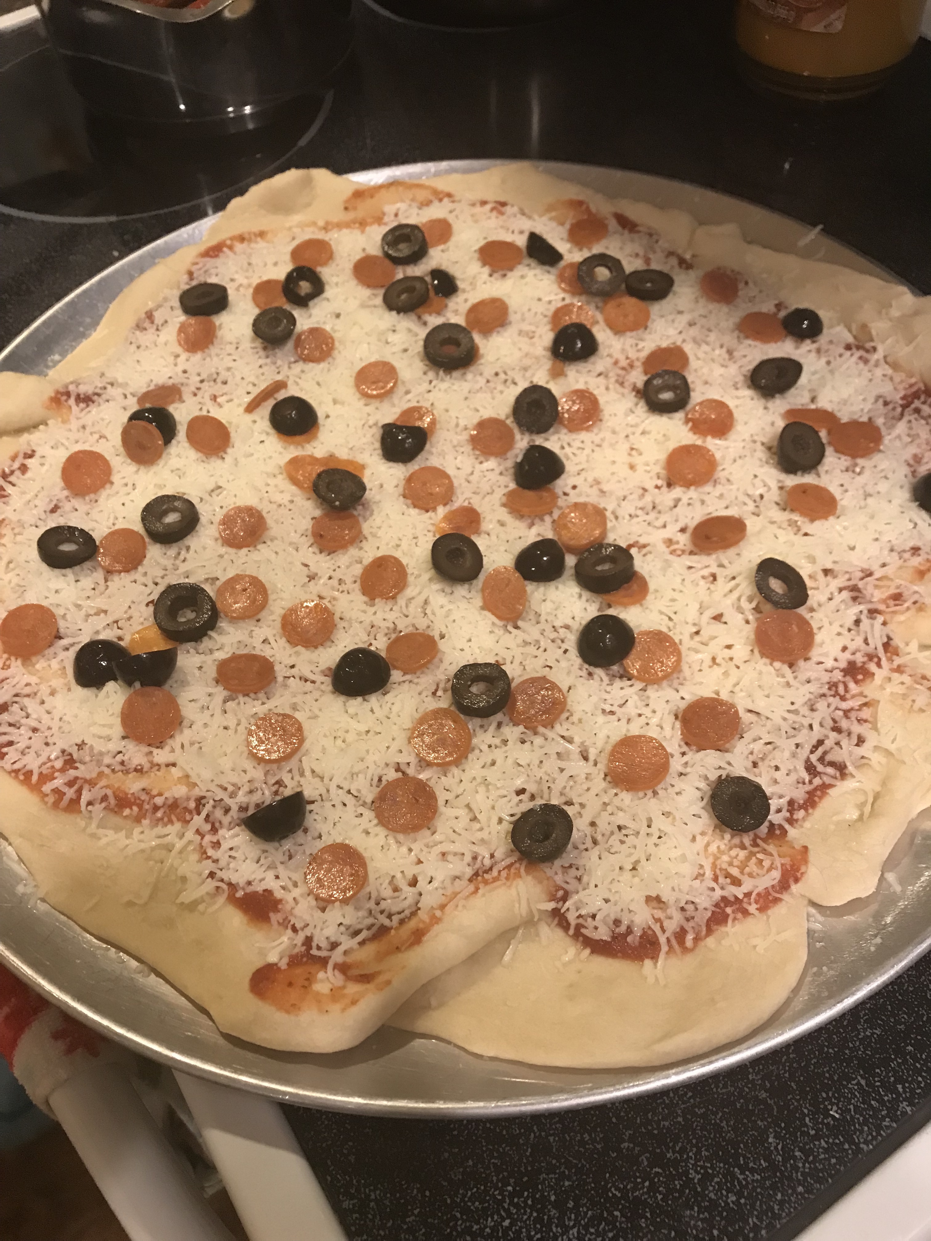 The kids’ favorite toppings are simple: sauce, mozzarella cheese, mini pepperonis, and black olives. We usually make a pizza with peppers, onions, mushrooms, etc as well.
