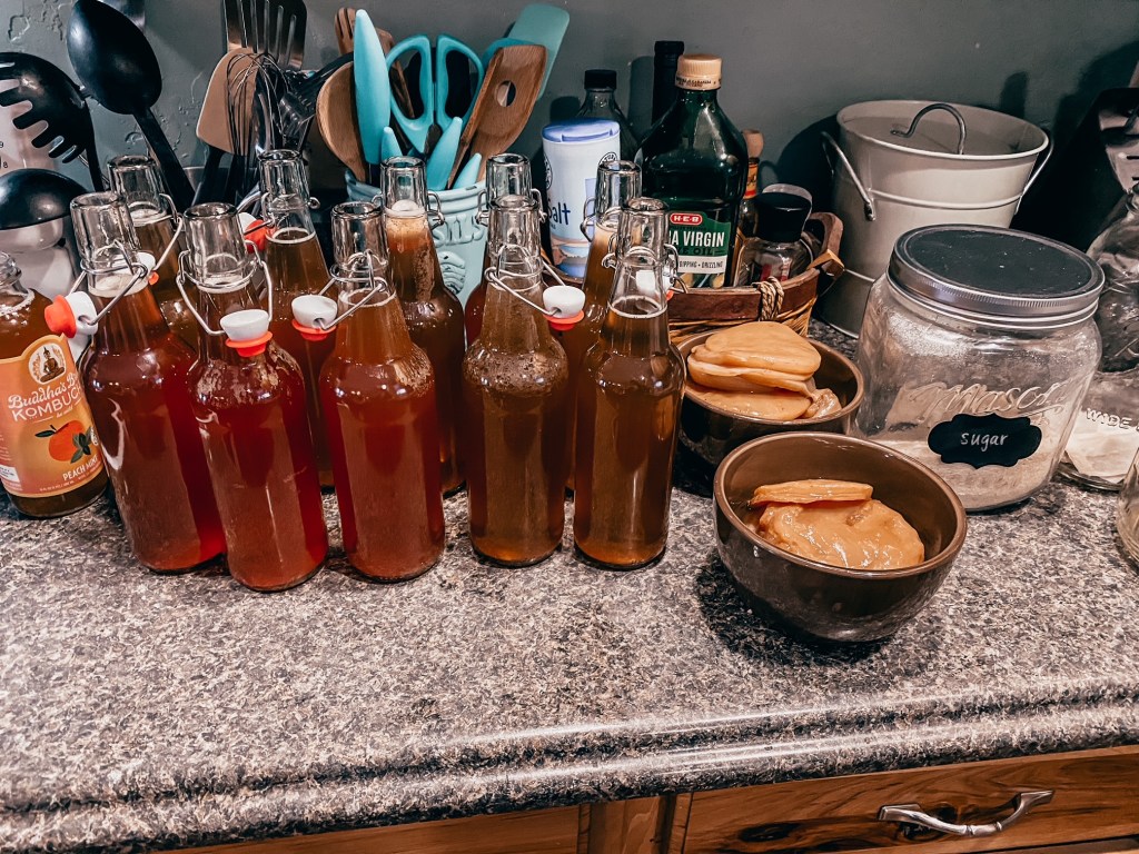 I make a LOT every time I make it. So what I’m sharing below is for 12-14 bottles (16-20oz). Most people don’t drink that much, but Levi likes my kombucha as well. It also has many health benefits and is a great replacement for soda. I still drink some soda, but not near as much as I used to.