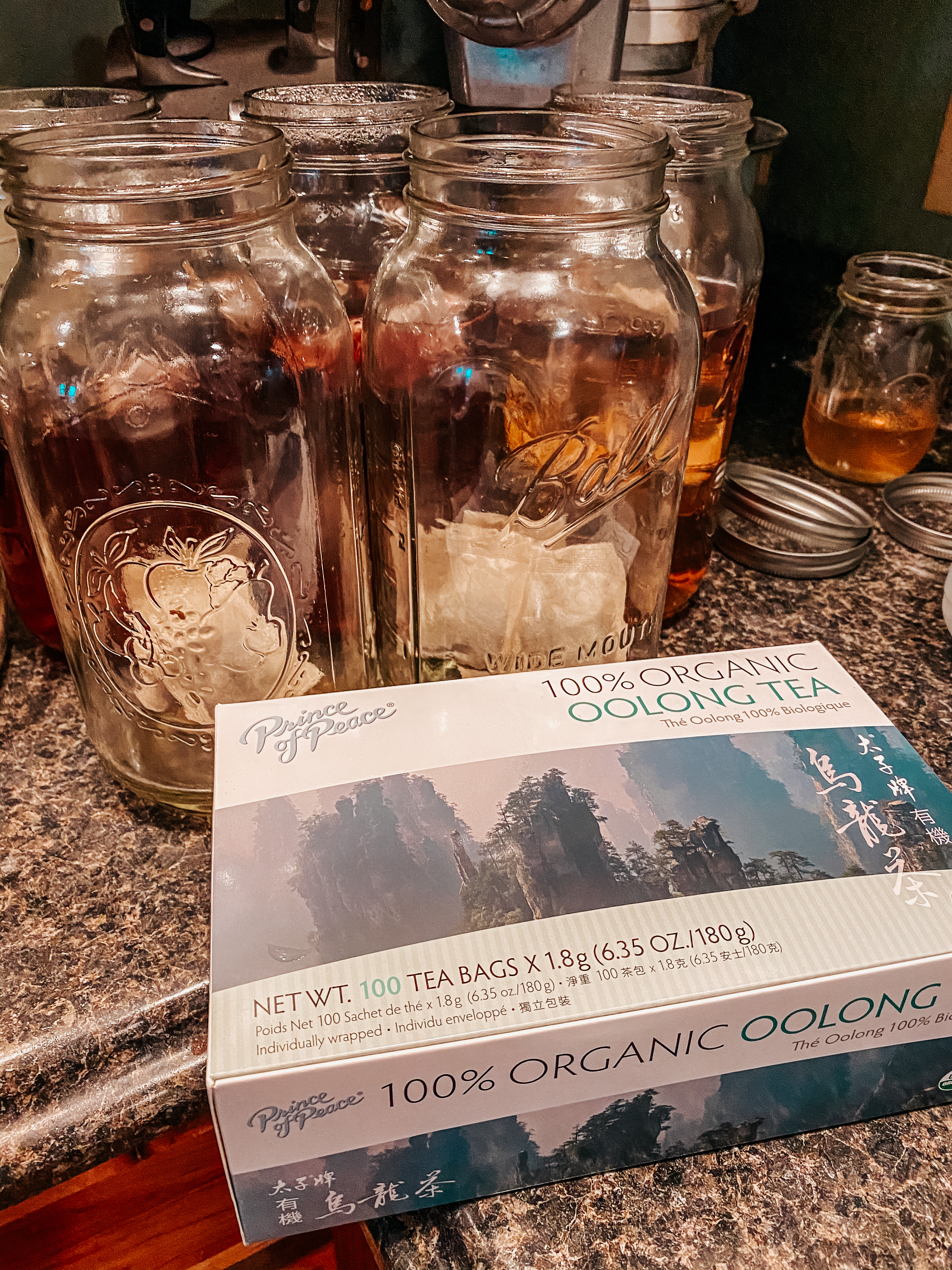 - 4-5 tea bags (I sometimes use 2 fruit tea bags and 3 oolong tea bags or just the oolong or black tea)