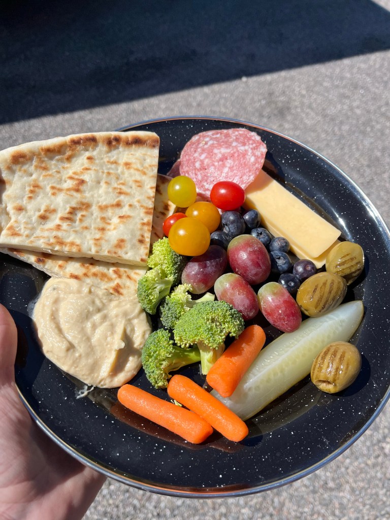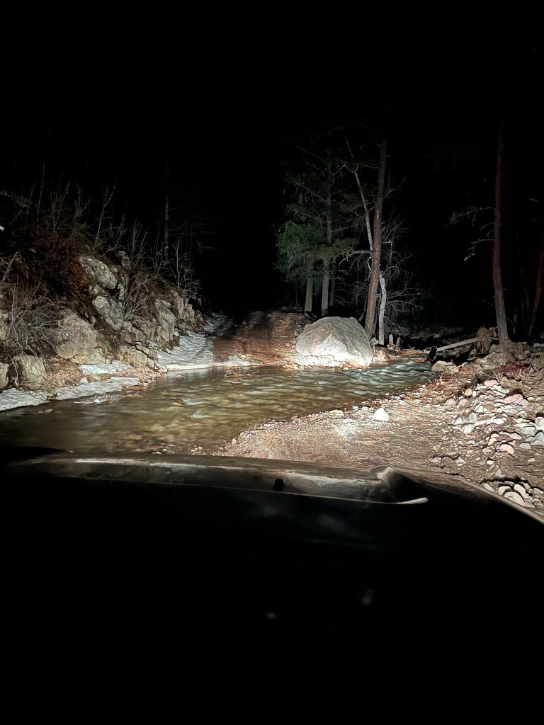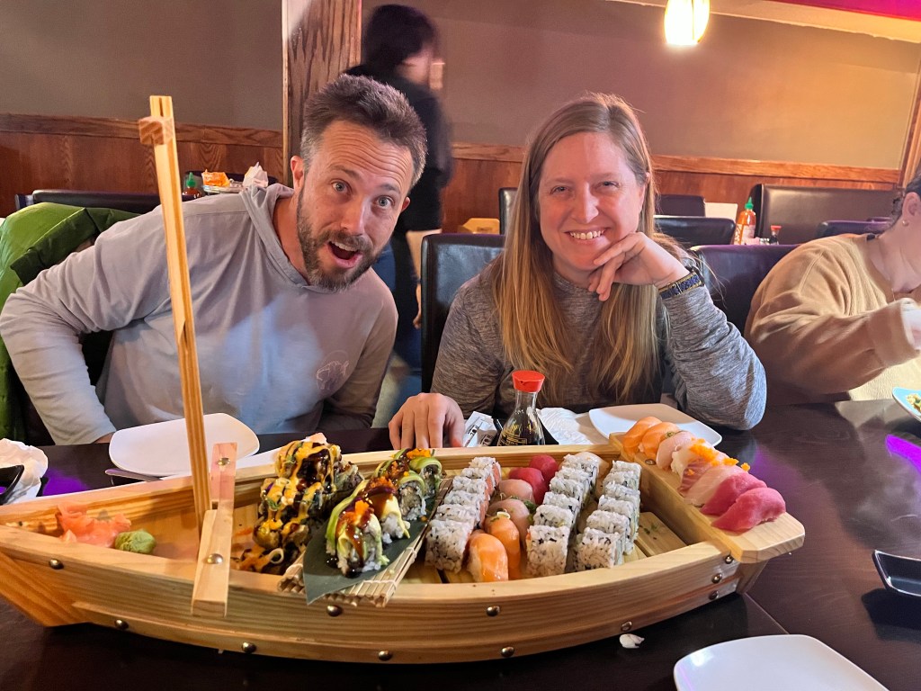 The drive up was long because not only did we have 10 kids ages 3 to 17 (and 6 adults), we had a blowout, we spent too long eating dinner (worth it for a sushi boat and great conversation- that’s not my husband in the pic with me haha), and then our friends’ brakes started over-heating on the way to our camping spot. We also hit lots of ice, snow, and sketchy low water crossings. Robert and I have made that drive 3 other times and it has never been that bad. The road was torn up from winter.