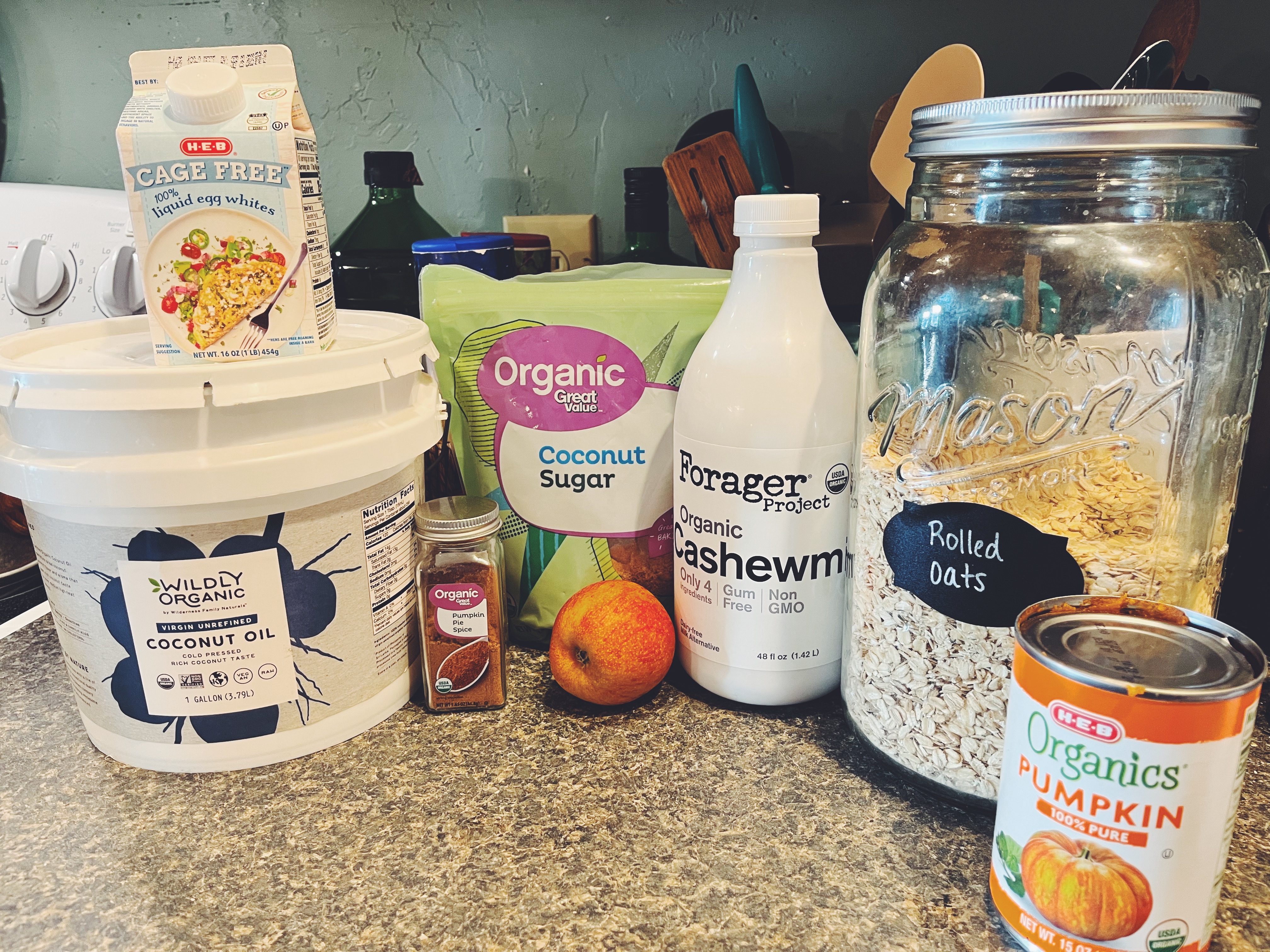 - Whisk in pumpkin, coconut sugar, pumpkin pie spice, and egg whites. Keep whisking constantly to keep the egg from scrambling.