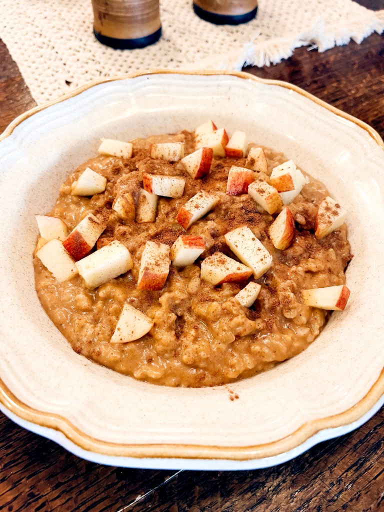- Pour the oatmeal into a bowl and top with diced apple and a sprinkle of cinnamon.