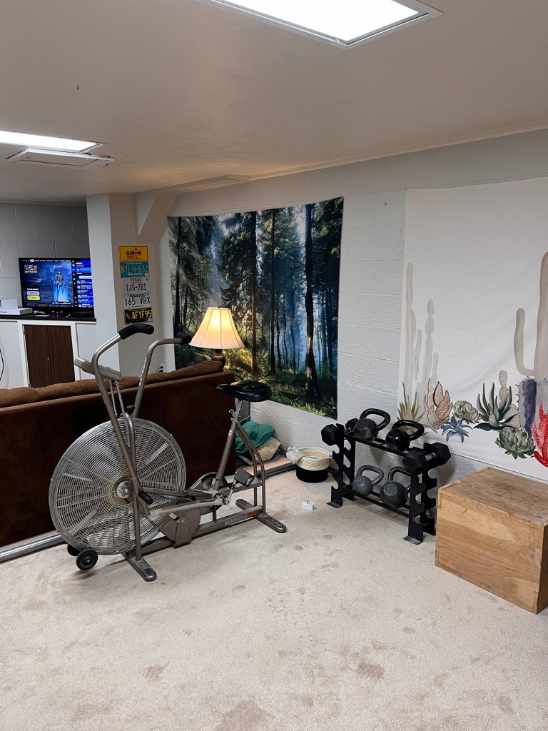 These are random pics… a new hoodie that I got today from our camp, a thrift store haul, and the tapestries that we have put up in our basement!