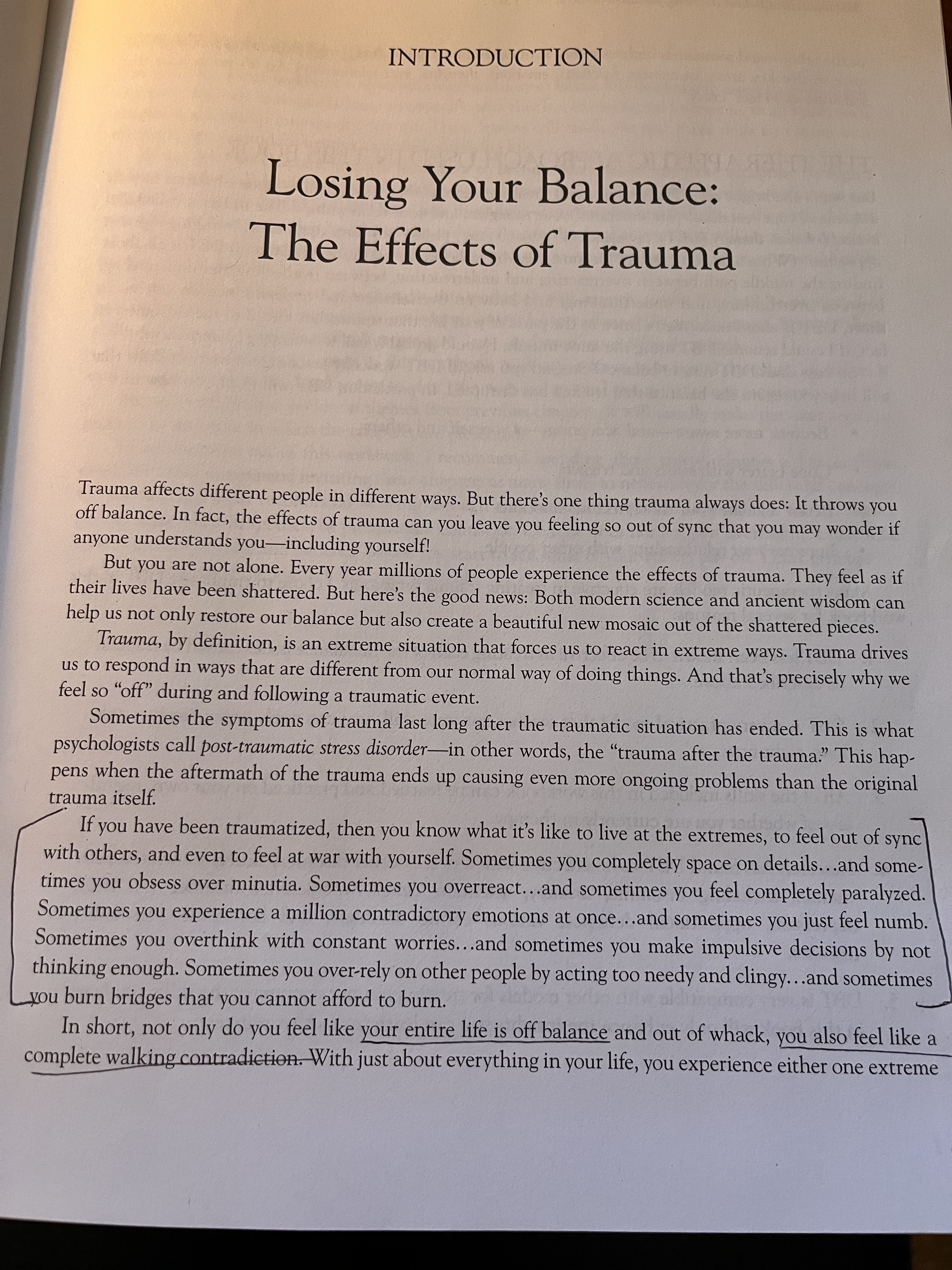 After my therapy session, I had lunch, then spent some time working on my Dialectical Behavior Therapy Skills Workbook for PTSD. I’m LOVING this book. I’ll share some more later, but I feel like it’s exactly what I struggle with. One of the things about PTSD is that it makes a person feel super off-balance which makes total sense. The purpose of this workbook is to help you build skills to be able to bring to extremes into balance.