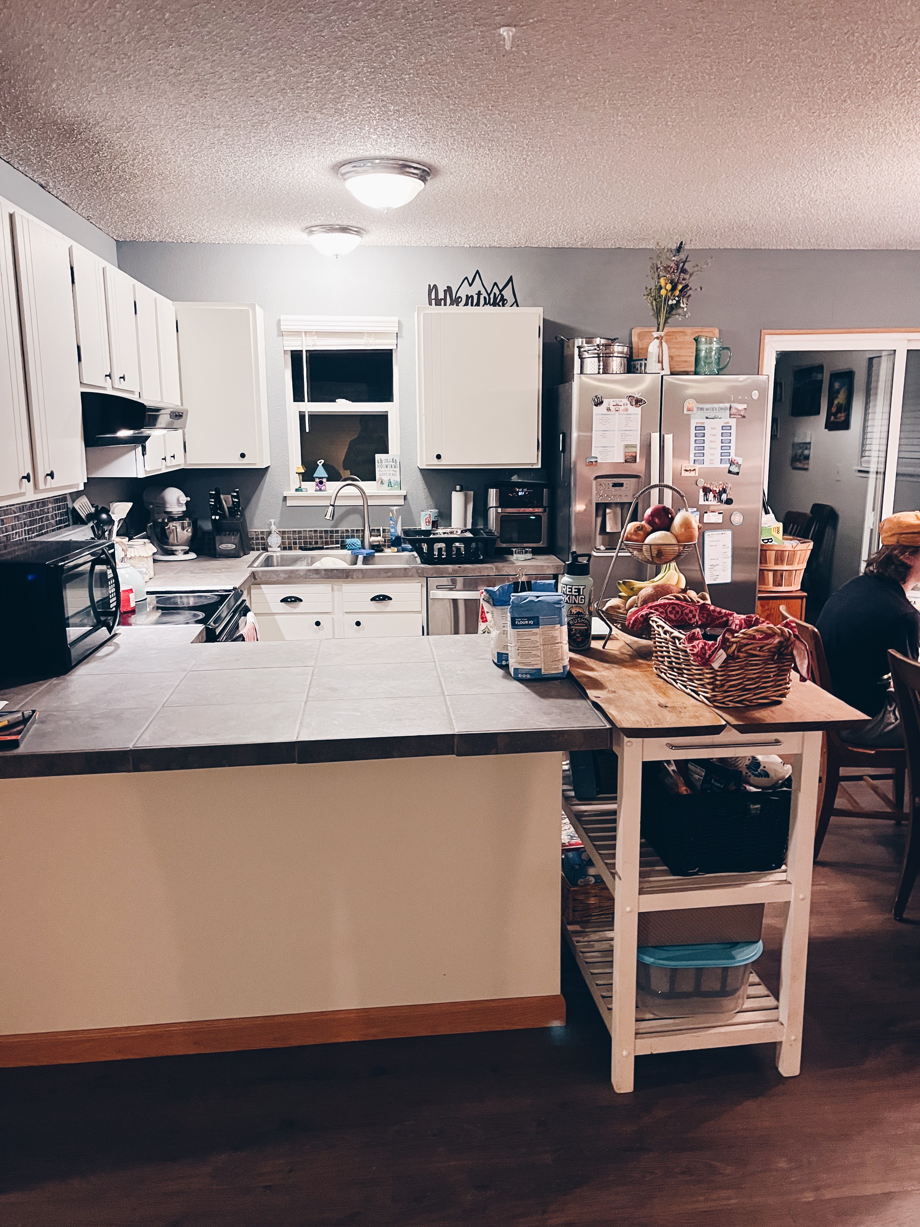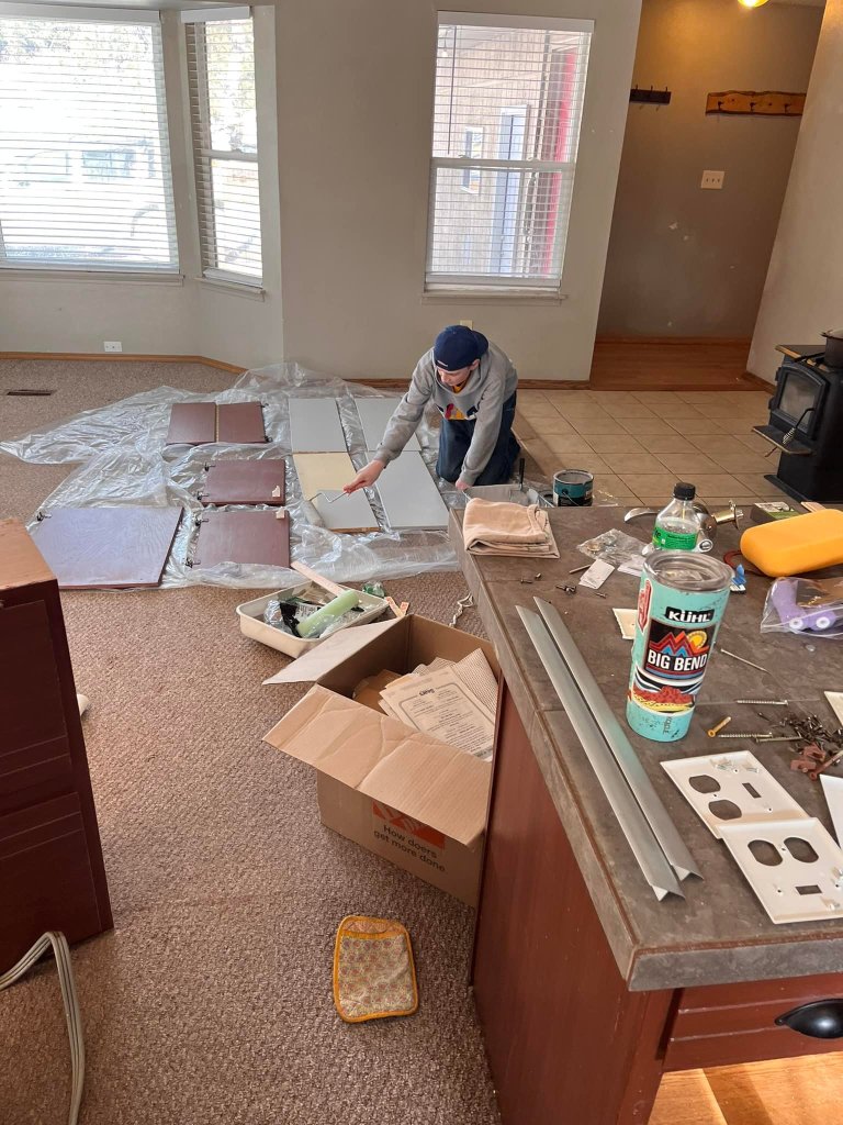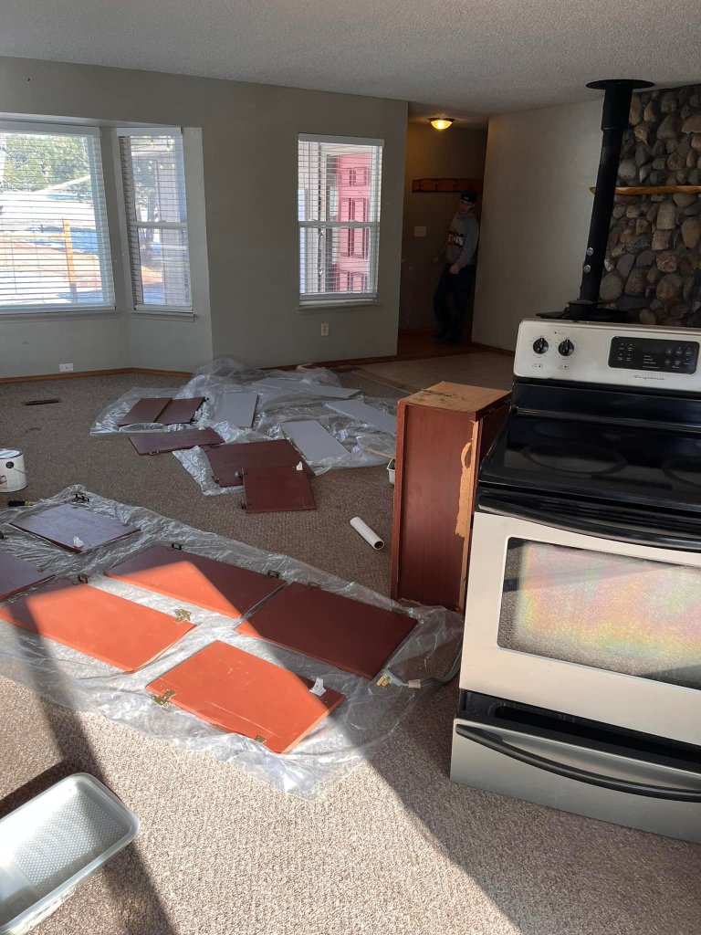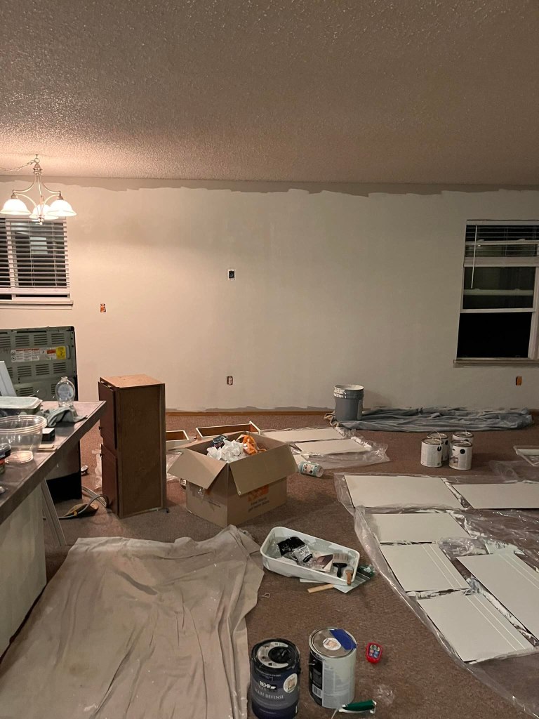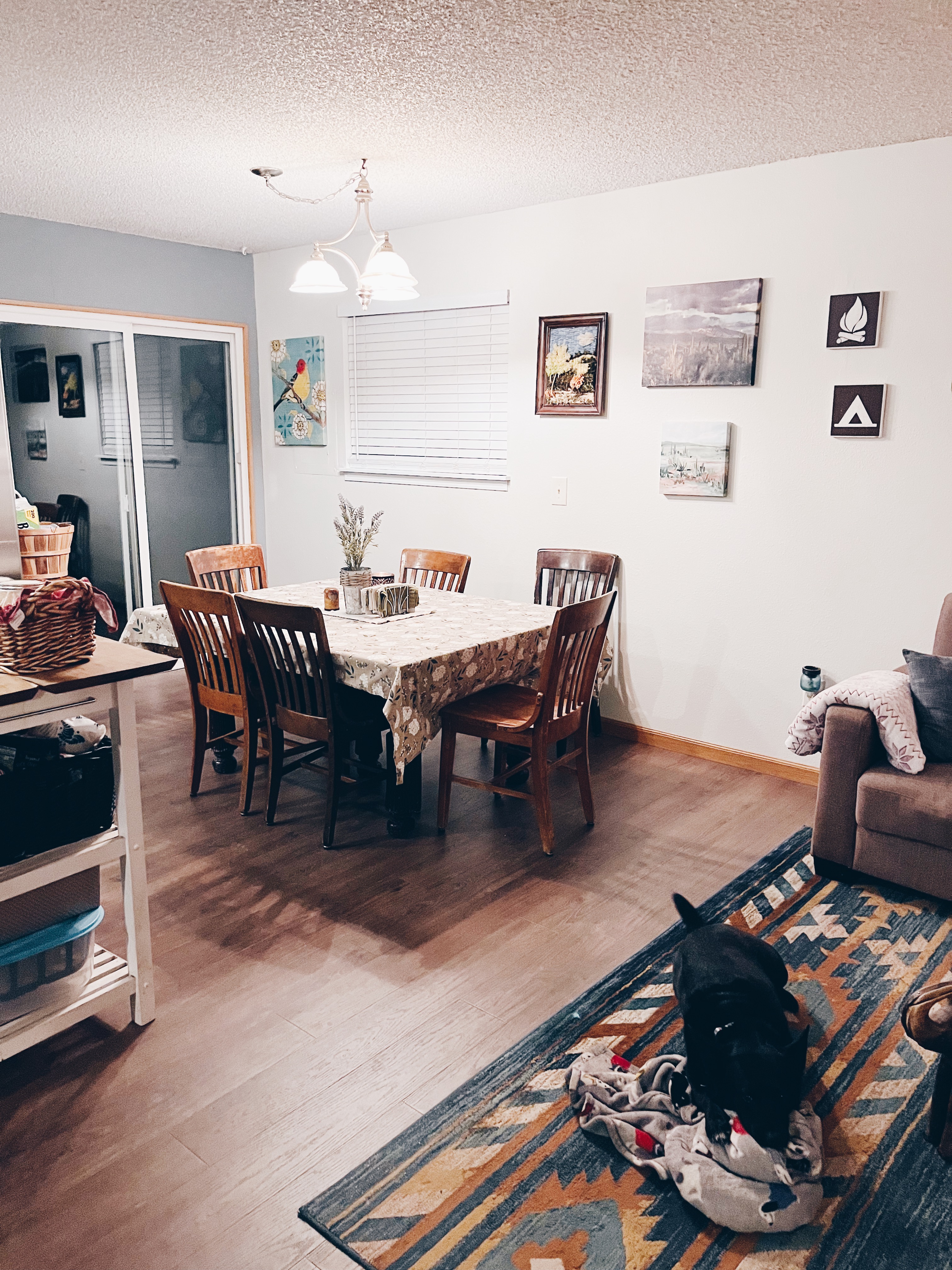 That weekend, we painted the whole living room, dining room, and kitchen (including cabinets). Robert accidentally spilled paint on the carpet in the dining room. We were going to replace the flooring in the dining room and kitchen because of that, but our director told us to just replace the flooring in the whole upstairs (except for the bedrooms) because the flooring was super old anyway. So, that was the next step. Robert spent hours and hours replacing the flooring, and it looks amazing!