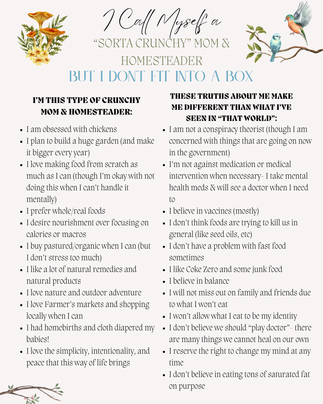 I’m realizing that I really do feel that the “crunchy/homesteader” “label” does fit me pretty well. I often run from labels because I do NOT fit nicely into a box. But, I do love so many things about that world including the intentionality and slowness that comes with that way of life. There are many things that I don’t agree with or that don’t fit me as well. I made a little graphic for myself to help me process through that, and I thought I’d share. I don’t owe anyone an explanation or anything, but it mostly helps ME. Which is what my whole blog is for! So, here it is!